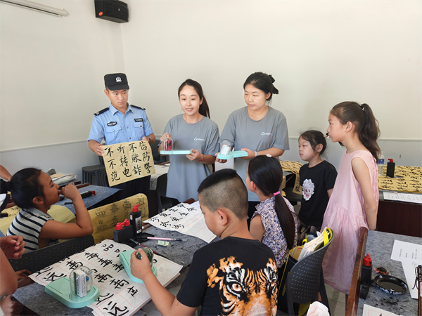 近日,高平市公安局三甲派出所民警和禁毒社工在三甲镇南河村组织开展“以笔为盾 远离毒品”主题宣传活动,巧妙将传统书法文化与禁毒宣传教育相融合,为暑期学子带来一堂既具文化底蕴又发人深省的“禁毒教育公开课”。 活动现场,孩子们在工作人员的指导下,以禁毒箴言为内容,在一笔一划的专注书写中,将对健康人生的理解与对毒品危害的警惕融入墨香。
