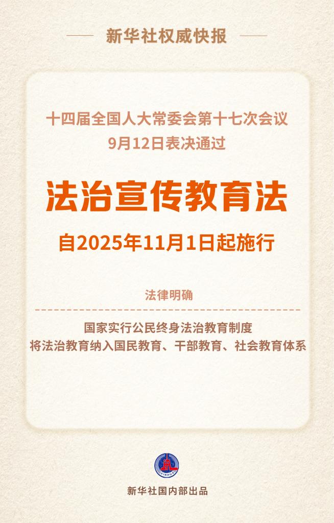 9月12日,十四届全国人大常委会第十七次会议表决通过了《中华人民共和国法治宣传教育法》,自2025年11月1日起施行。法治宣传教育法共7章65条,包括总则、社会法治宣传教育、国家工...