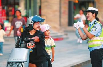 9月8日,在临汾市区贡院街,执勤民警为文明出行的小朋友点赞。正值开学季,临汾交警在校园周边及重点路段加强交通疏导和秩序维护。