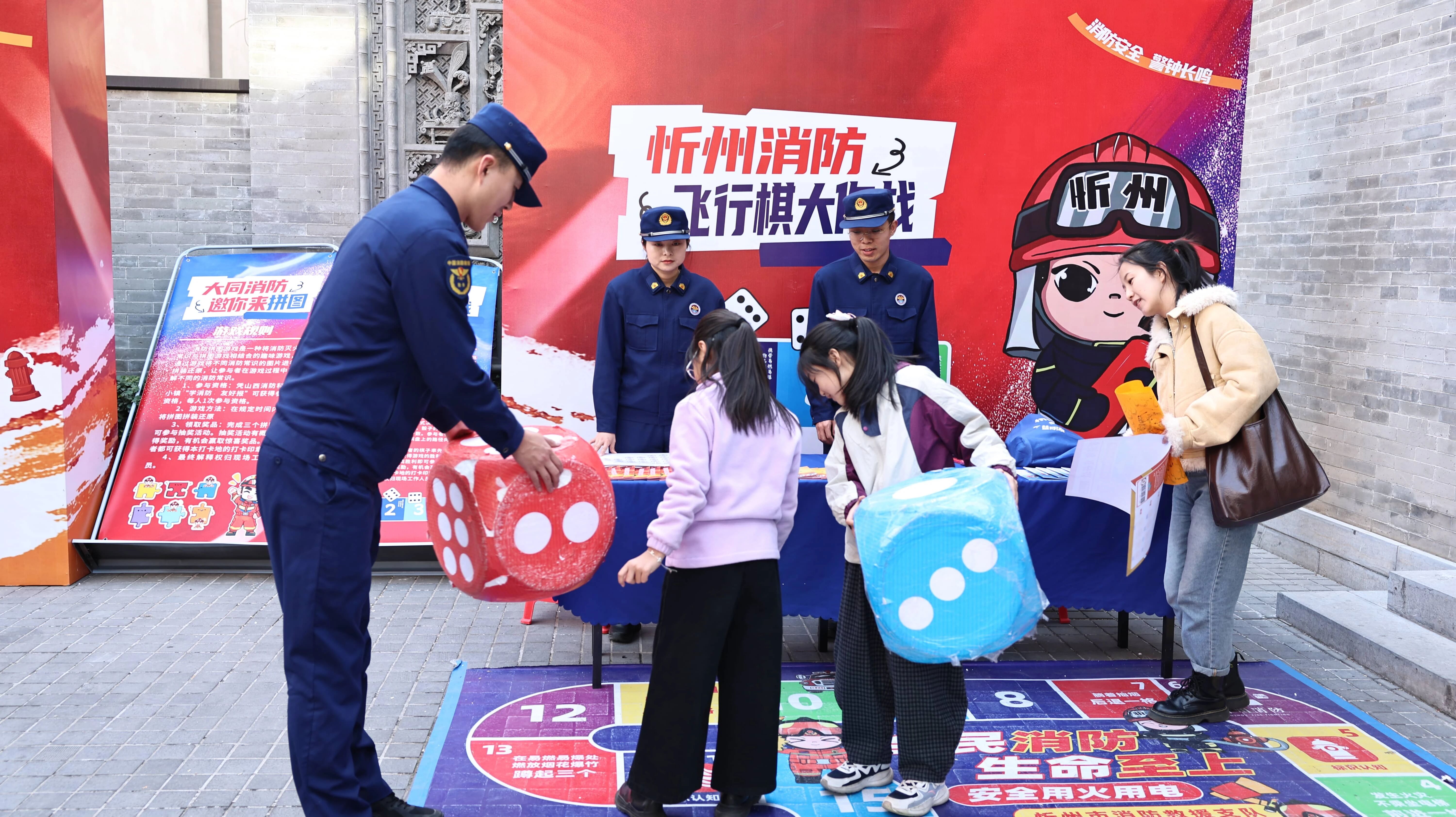 一踏入忻州消防的消防飞行棋大作战游戏区域,鲜明的消防主题场景瞬间点燃孩子们的热情。巨型飞行棋棋盘铺满地面,格子上印着“家庭防火小贴士”、“火灾逃生误区”、“消防器材识别”等趣味知识点,“小不点军团”迈着欢快的步伐,排好队掷起了骰子。