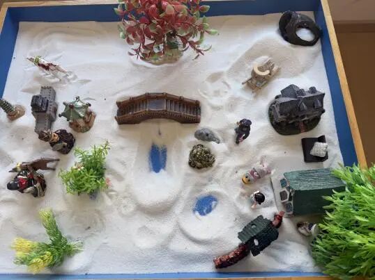在亲手创造环节,干警们在沙盘前静静驻足,从琳琅满目的模型架上自由挑选心仪的模型,开始在沙盘中构筑属于自己的世界。这一刻被咨询师称为“神圣时间”——没有对错,没有评判,只有指尖流淌的创意与内心深处的声音对话。有的干警构建了宁静的田园风光,有的则塑造了壮丽的山川河流,每一件作品都是内心世界的真实映射。